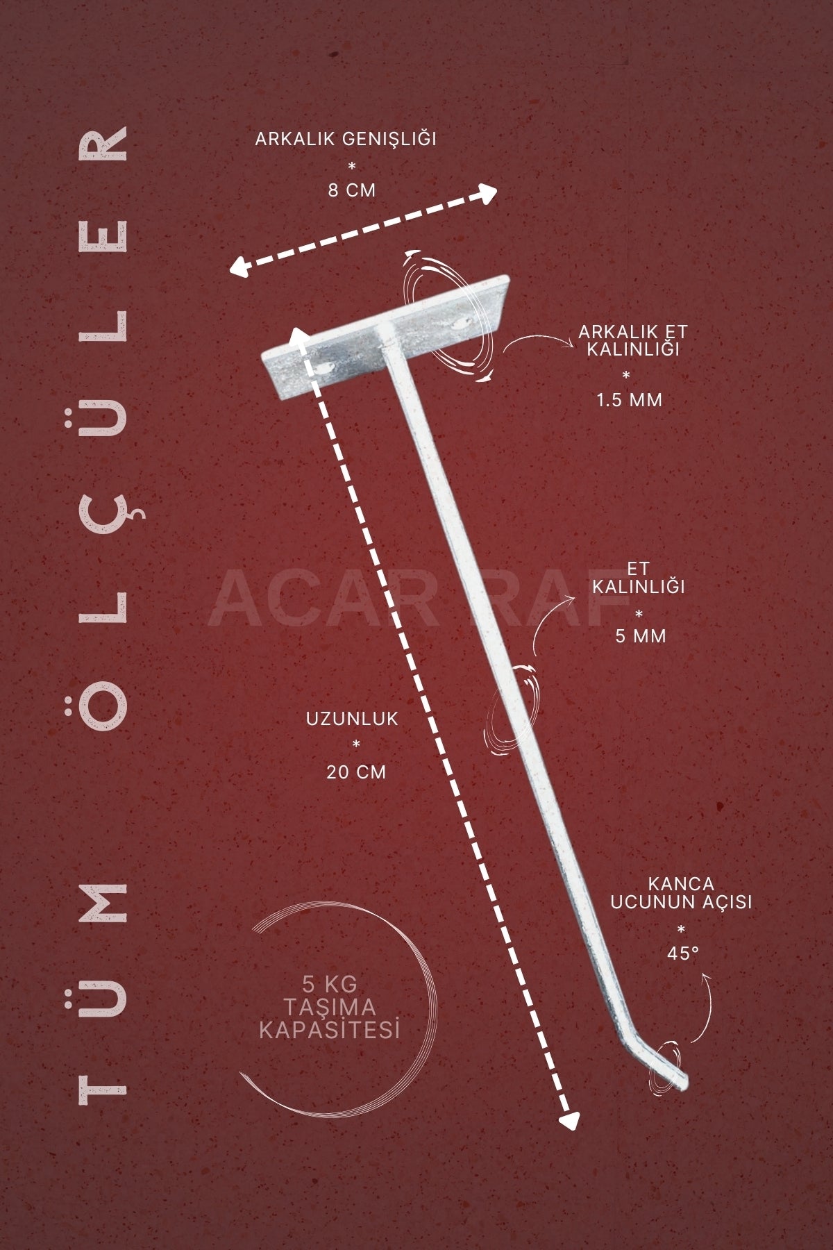 Kancanın uzunluğu 20 CM, arkalık genişliği 8 CM, kanca çubuğunun/etinin kalınlığı 5 MM, arkalığın kalınlığı 1.5 MM, kanca ucunun açısı 45 'dir. Rengi galvaniz kaplama kromdur. 5 KG taşıma kapasitesi vardır.